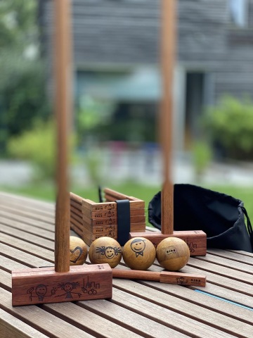 Golf kroket je zábava na celé odpoledne! Hra s dotaženými a svižnými pravidly. Hra, kterou jednoduše sbalíte do vaku či tašky a vydáte se s ní klidně na konec světa. A aby to nebyla nuda a kroketové koule s holí jste od sebe bezpečně a pohodlně rozeznali, grafický designér firmy UAX, Radek Leskovjan, navrhl zdobení jednotlivých hracích elementů ručně kreslenými obrázky, které potěší děti i dospělé svým hravým a veselým designem.