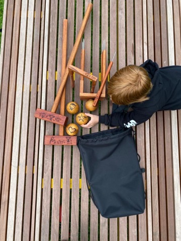 TAŠKA přes rameno, navržená Kateřinou Vavrouškovou, standardně není součástí balení. Kroket si lze nakombinovat samostatně a tašku si k němu vybrat z několika barevných variant. Předností tašky je dno z překližky, jako ochrana špičatých hrotů branek a kolíku. Uzamykatelná kapsička s nepromokavými zipy na návod či jiné drobnosti.