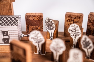 Když máte postaveno, můžete začít stavbu zaplňovat a zkrášlovat. Každý příběh má své postavy v podobě obrázkových domin. Tato herní sada se pyšní tetou Inou a její dcerou Grétou, rýčem, stromkem borovice, stromkem dubu, stromkem buku, liškou, sokolem, můrou, ohňem, velkým kotlíkem, bubnem a kamarádem Dušanem.