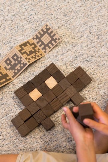 Herní sada obsahuje 100 kusů čtvercových kostek světlé a tmavé barvy. Díky jednoduchému principu kladení světlých a tmavých ploch, může každý hráč vytvářet nekonečné množství obrázků a staveb. Pro ty, kteří rádi skládají podle předlohy jsme připravili leporela s tématikou přírody a města, obrazců a květů, které poslouží pro inspiraci.
