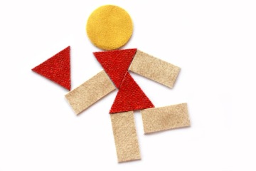 Z tvarů vyskládej panáčka a části obličeje vystřihni z nepoužitých látek. Vše nalep na papír.