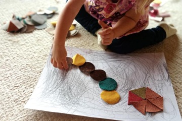 * Můžeš zkusit skládat tvary různě přes sebe, aby ani místečko nezůstalo bílé. Po přilepení vznikne mozaikový obrázek, příjemný na dotyk - hotový plyšák.